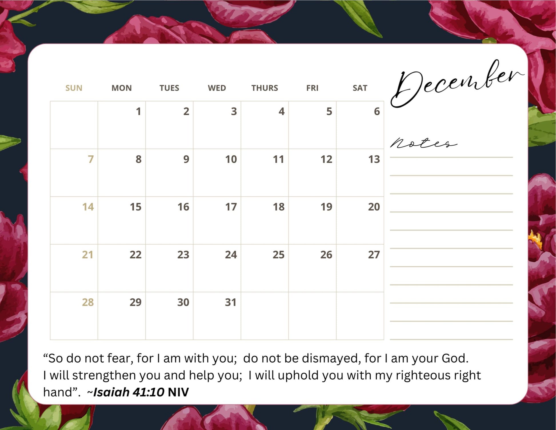 This calendar isn’t just a tool for organization – it’s a source of spiritual nourishment. Every scripture reminds you to walk in faith and lean on God’s promises, while the exquisite red floral design brings joy and serenity to your daily routine.